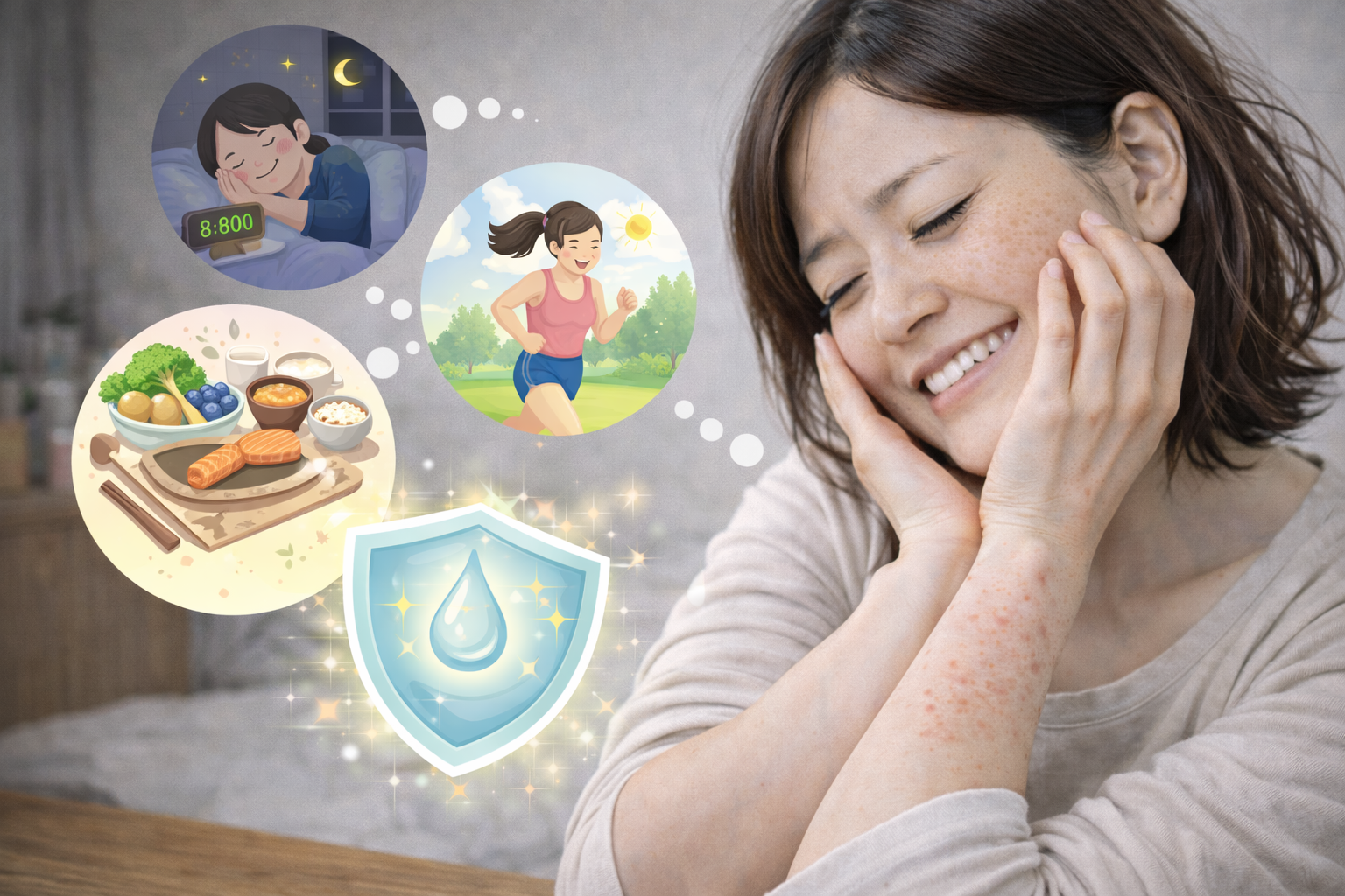 アトピーを考えるときは、スキンケアだけでなく生活習慣を見直すことも大切です。食事、睡眠、生活リズムなど、日常生活の習慣を整えることが体調管理につながります。