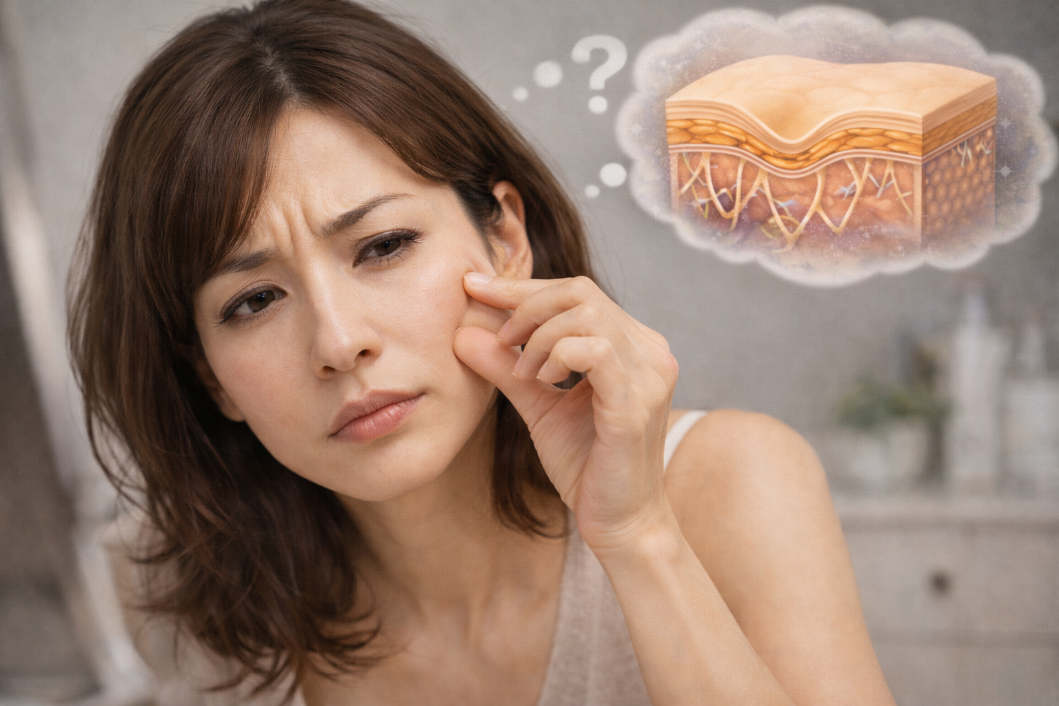 「最近、頬がしぼんだ感じがする」「ファンデーションがうまくのらない」「写真を撮ると老けて見える」――そんな変化に気づくと、年齢のせいだと諦めたくなりますよね。