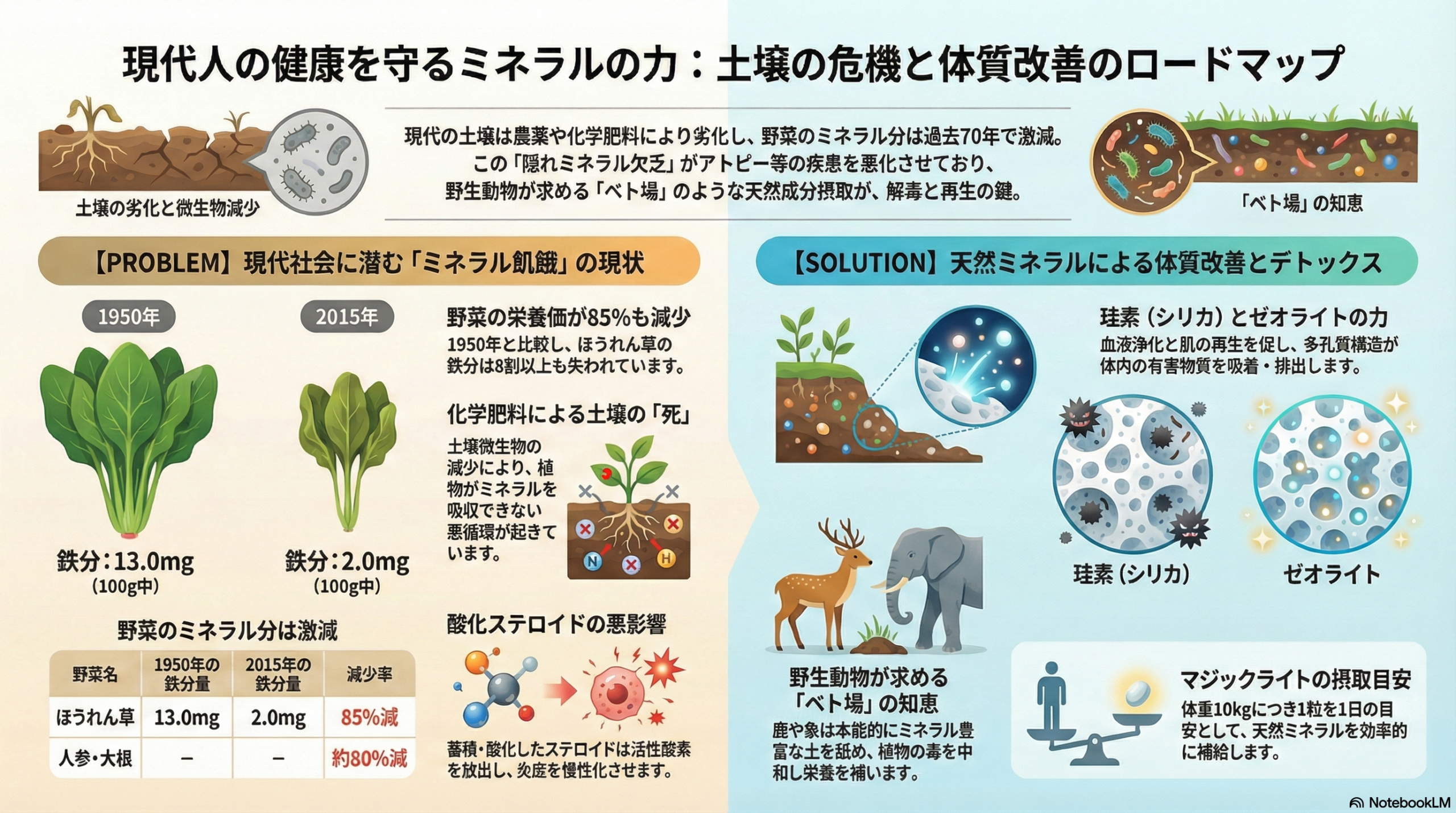 この劇的な栄養不足の原因は、農薬や化学肥料の多用により土壌そのもののミネラルバランスが崩れ、微生物が減少した現代農法にあります。もはや、食事だけで十分な鉄分を確保することは極めて困難なのが現実です。
