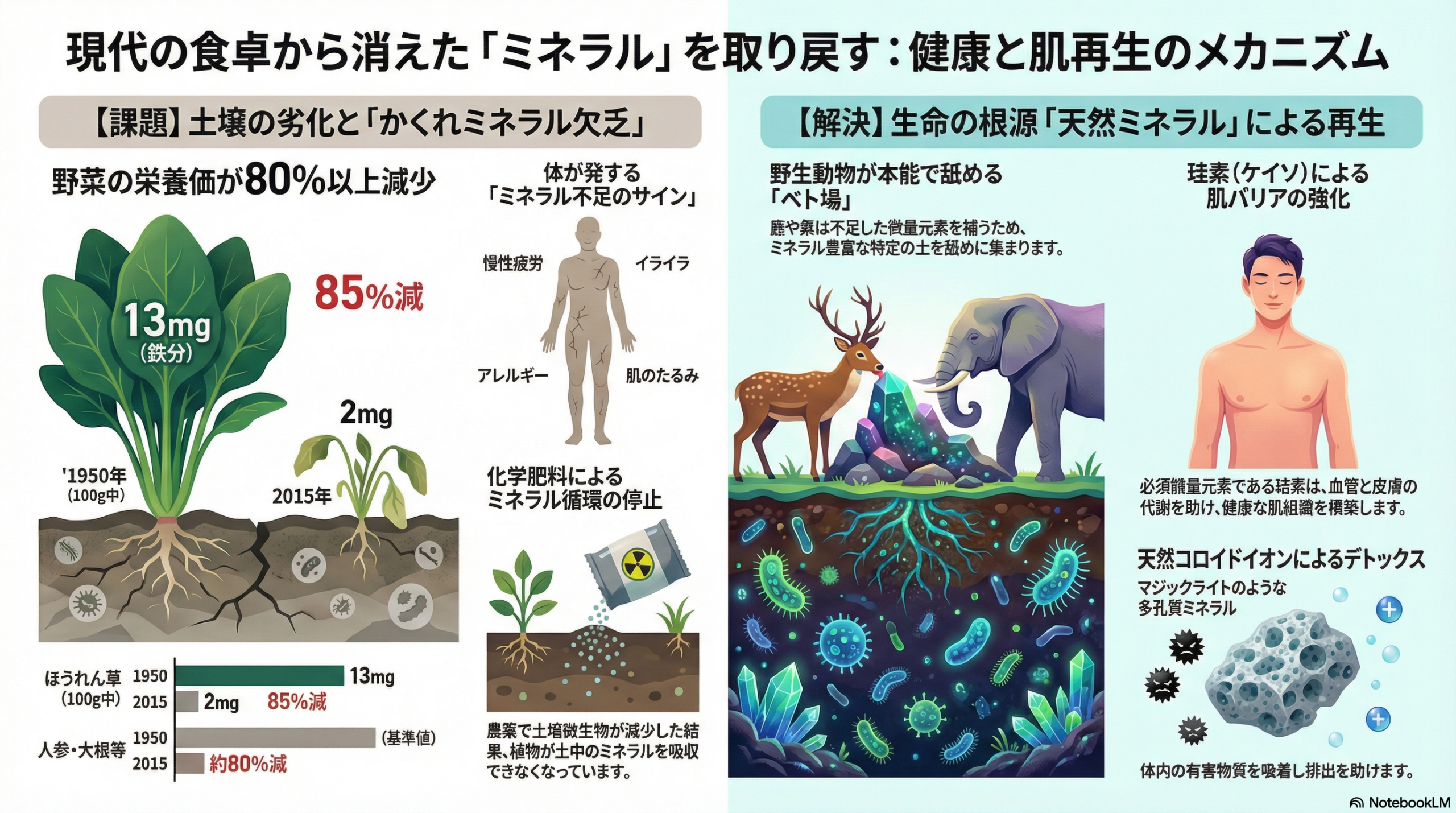私たちの体は、食べたものでできています。しかし、現代の「栄養スカスカな野菜」だけでは、細胞が求めるミネラルバランスを維持することは困難です。